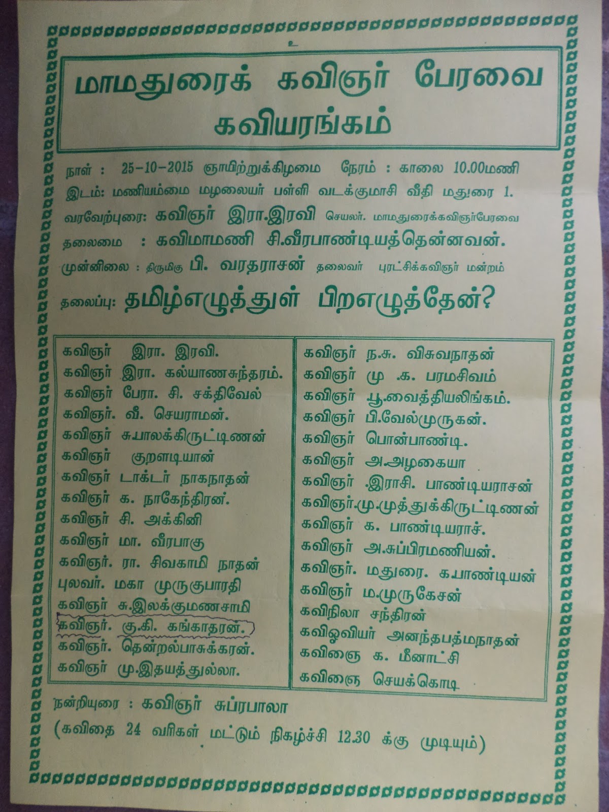பேரவை நடத்திய கவியரங்கத்தில் மதுரை கங்காதரன் இயம்பிய